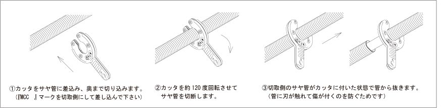 ●サヤ管の横から挿入、クルッと1/3回転でクイックカット。