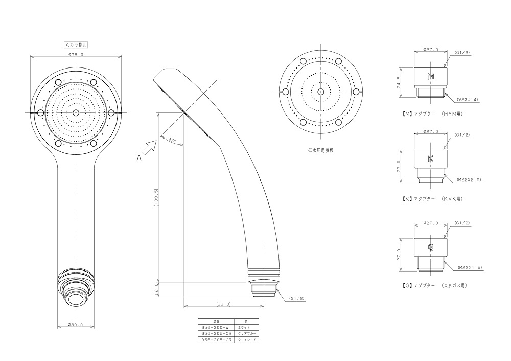 ●低水圧(低流量)対応用シャワーヘッド 動水圧0.05MPa、流量5L/分の条件で使用できます。