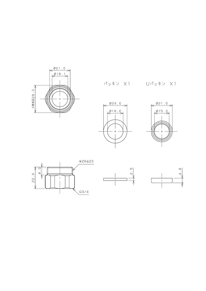 ●G3/4ネジ(海外製水栓など)に、外径16ミリ・W26山20のパイプを取付けるアダプター