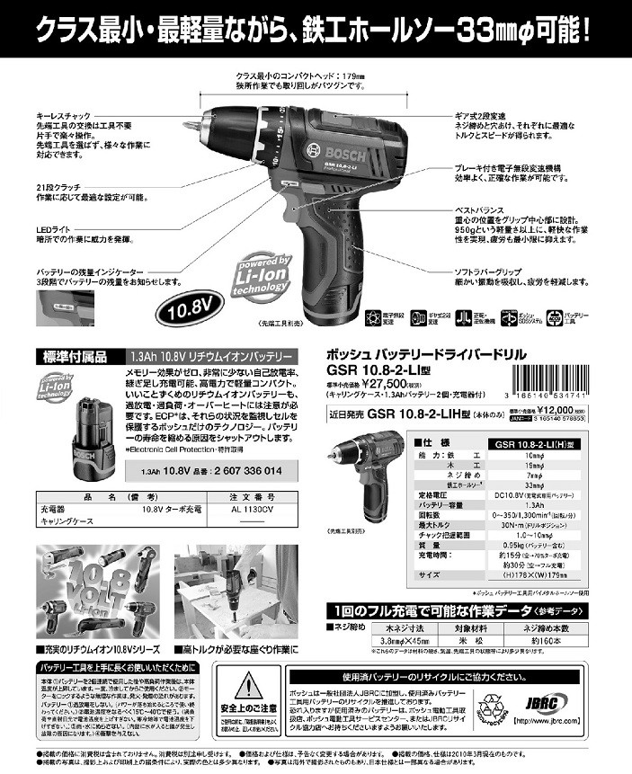 ボッシュ コードレスドライバードリル GSR 10.8-2-LI/GSR 10.8-2-LIH(本体のみ)
