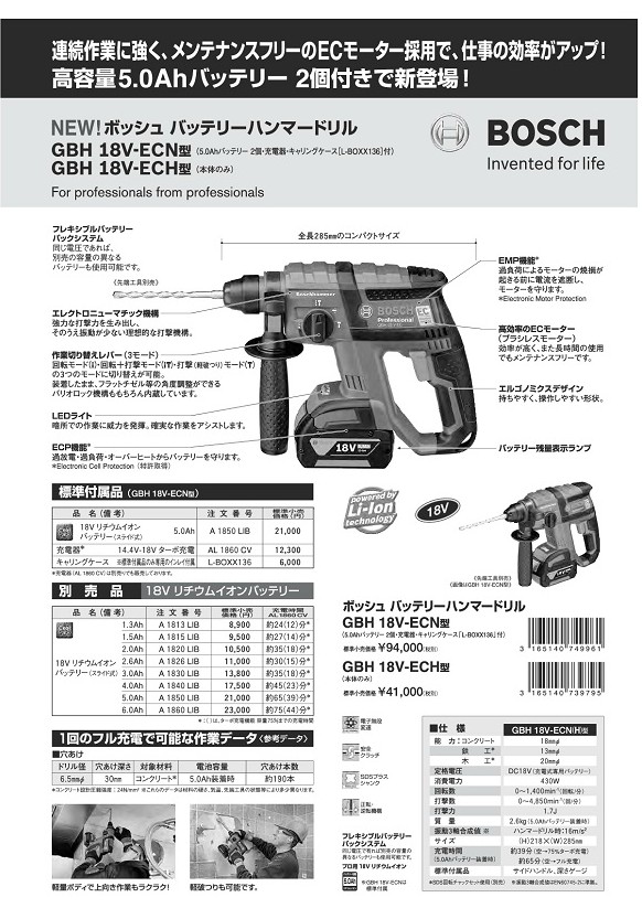ボッシュ コードレスハンマードリル GBH 18V-ECN/GBH 18V-ECH(本体のみ)