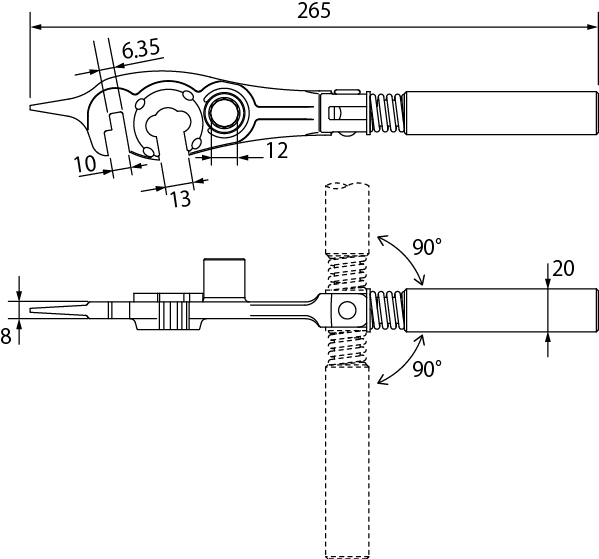 ●ハンドル部は上下にそれぞれ90°曲がり、L字型になります