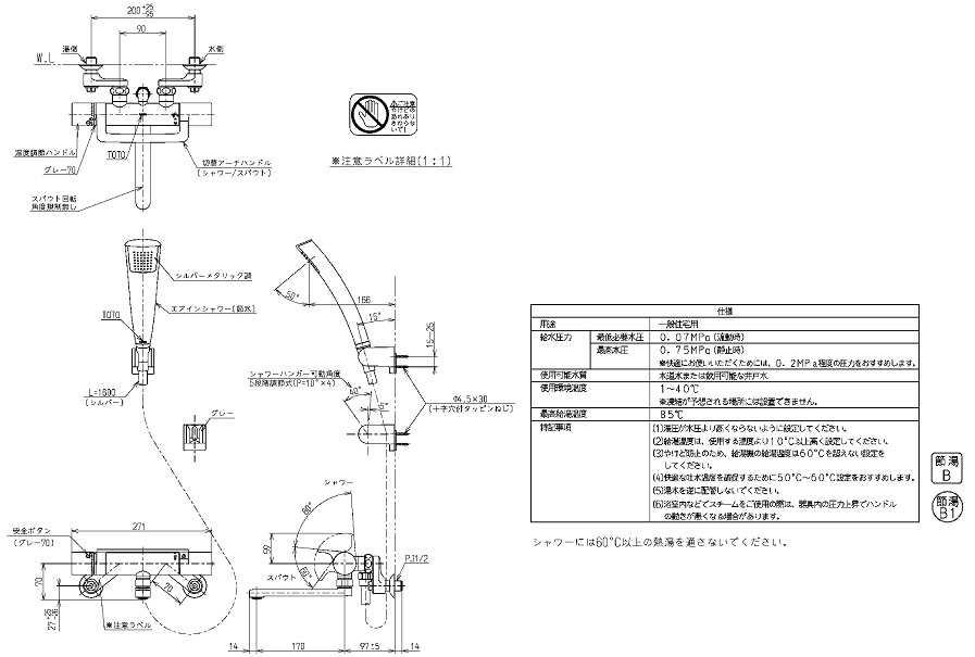 ●めっきのシャワーヘッドは公衆浴場、レジャー施設など不特定多数の方が頻繁に利用する浴場では、めっきの表面が割れる可能性が高くなるため使用できません。