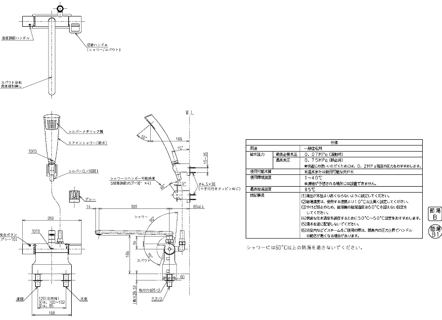 ●めっきのシャワーヘッドは公衆浴場、レジャー施設など不特定多数の方が頻繁に利用する浴場では、めっきの表面が割れる可能性が高くなるため使用できません。