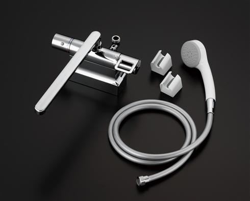 ●浴槽の水栓取付穴のピッチに合わせて心々の距離を調節できる、取り替え用のサーモスタット混合水栓。