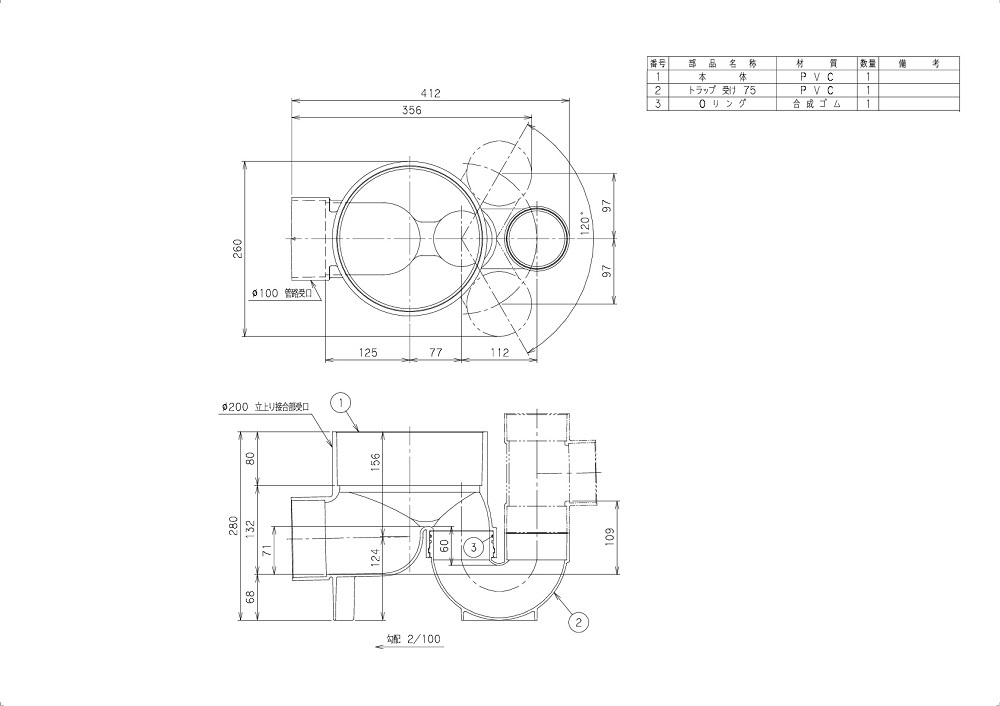 ●管路タイプ:主管100 トラップ径75(受口)蓋径200