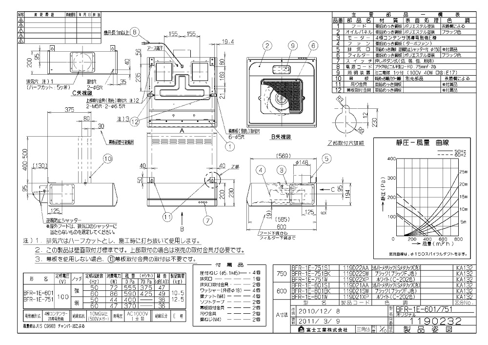 レンジフード 浅型 BFR1E751 BK/W/SI