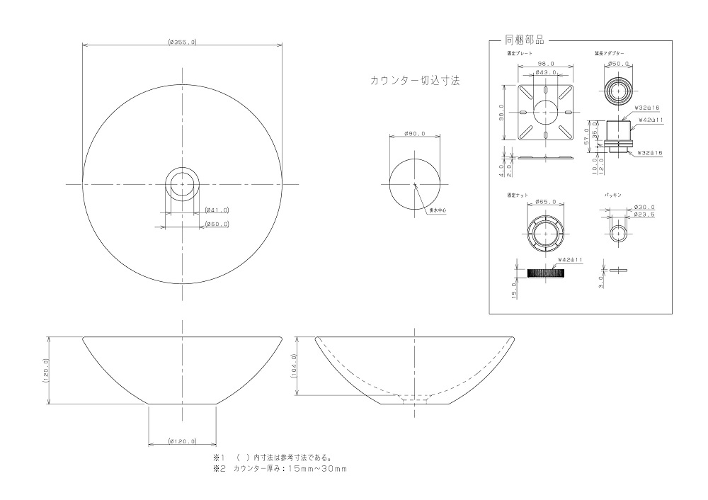 ※水栓金具、排水金具(排水トラップ)、止水栓は含まれていません。