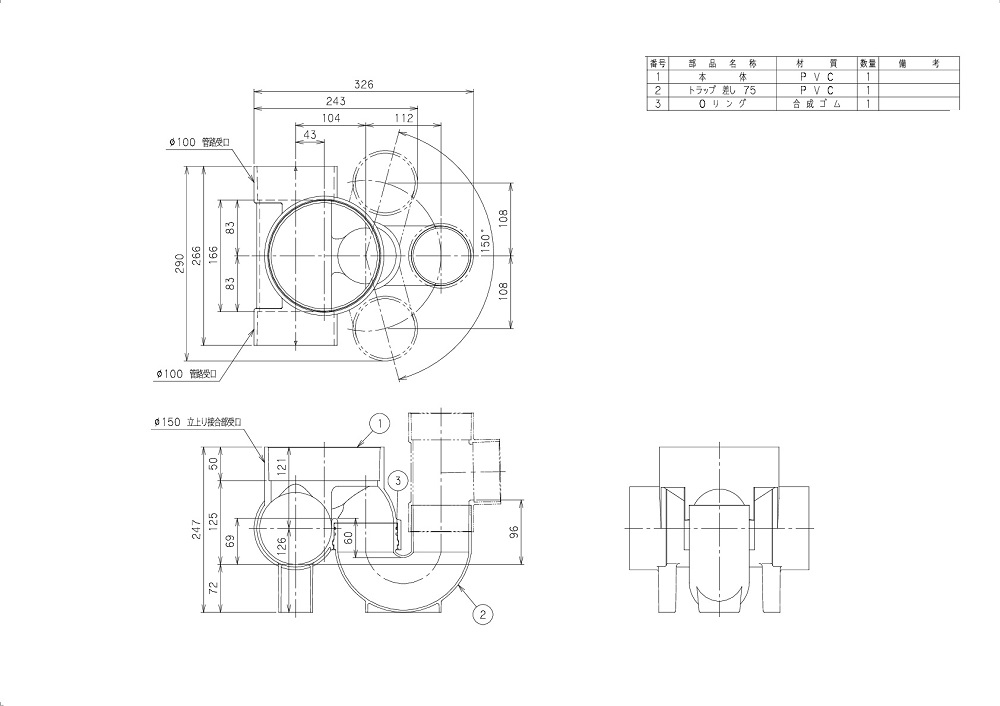 ●管路タイプ:主管100 トラップ径75(差口)蓋径150