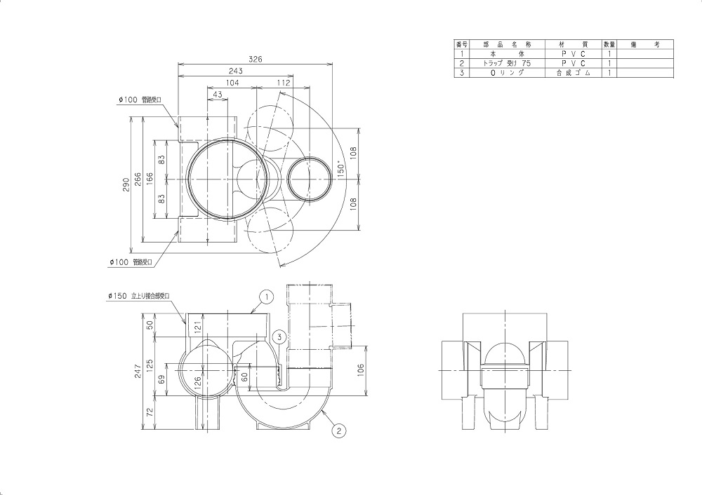 ●管路タイプ:主管100 トラップ径75(受口)蓋径150